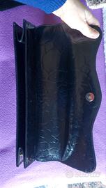 Vendo borsa che si può usare come pochette o borsa a tracolla vintage in pelle lucida nera, con motivo cocco. È caratterizzata da una chiusura a busta con una fibbia decorativa rotonda color oro e una sottile tracolla regolabile dello stesso materiale della borsa