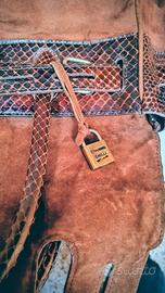 vacchetta scamosciata e stampa cocco, tipo Kelly, colore marrone ruggine, misure larga 29 cm, alta 21 cm , profonda 16 cm. Foderata internamente con taschina laterale