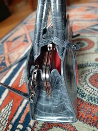 Misure in cm.: lungh. 26,5; alt. corpo 21, alt. ai manici 32; prof. alla base 13. Tracolla regolabile a 5 fori, di lungh. max. 118 cm.