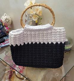 borsa grande ,fatta a mano all'uncinetto con manico in bambù