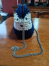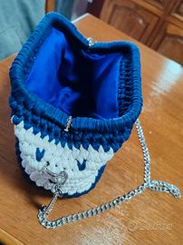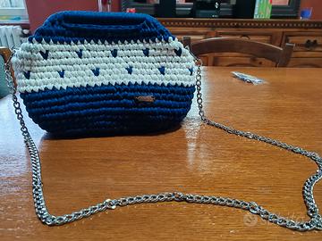 Borsa ad uncinetto fatta a mano, con chiusura a clutch + catena. Motivo a cuori, blu e bianca, su base rigida.