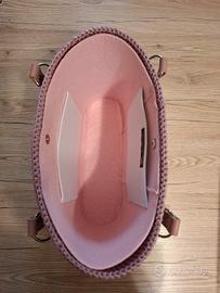 Borsa fatta a mano in cordino swan black color cipria scuro e panna, il fondo è in ecopelle rossa e i manici color rosa misurano 45cm. Le misure sono 30cm × 10cm ed è alta 24cm. Fodera in feltro rosa con tasche bianche a contrasto. Chiusura a clip in metallo.