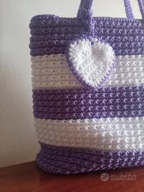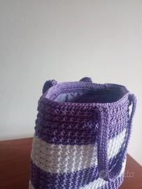 Borsa color Lilla e bianca,fatta all'uncinetto con mani o e ciondolo fatti a mano e fondo in similpelle