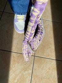 Borsa fatta a mano all’uncinetto, modello dusk bag. Realizzata con fettuccia in poliestere nei colori lilla e albicocca, abbellita da spille decorative lilla e marroni e catena di perle. Morbida al tatto, comoda e spaziosa, può essere indossata sia a spalla che a mano.