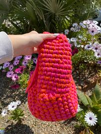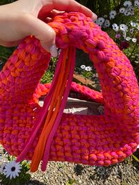 Borsa fatta a mano all’uncinetto modello egg bag, realizzata con fettuccia in poliestere nei colori fucsia e arancione con frange decorative, perfetta per l’estate. Molto capiente, manico resistente, morbida al tatto ma compatta.