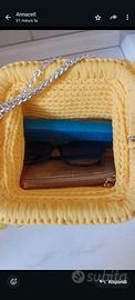 Borsa realizzata all'uncinetto in tulle elasticizzato. Dimensioni: larghezza 23cm, altezza 18cm, profondità 12cm. Se interessati potete ritirare l'articolo presso l'edicola PrimaPagina in Viale Stazione a Casarano.