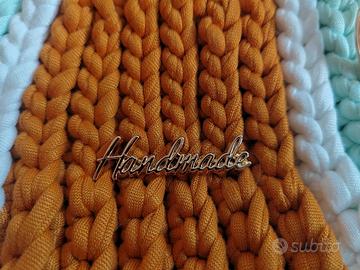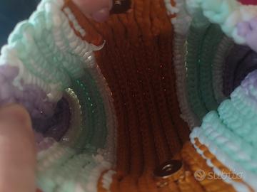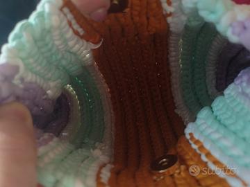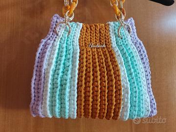 Borsa come da foto realizzata a mano. Materiale: fettuccia in lycra Dimensioni: 25cm x 23cm Altezza tracolla: 20cm