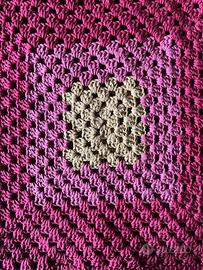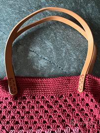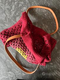 Borsa lavorata all'uncinetto con motivo a quadri centrale che ricorda una "granny square" (piastrella della nonna).Realizzata con filato di cotone , trama a maglie ben visibile conferisce un aspetto rustico e artigianale. Manici in pelle chiara. Colori predominanti rosa e rosso con evidente quadrato centrale color verde lime. Misure: altezza totale (comprensiva dei manici) 66 cm, altezza manufatto 44 cm., Larghezza 37 cm.