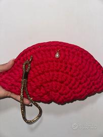 Borsa fatta a mano in fettuccia a forma di conchiglia, con decorazioni e polsino in strass bronzo.