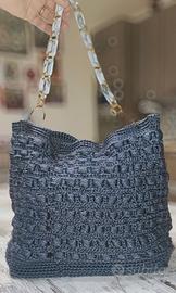 Borsa fatta a mano ad uncinetto, colore grigio scuro. Nuova. Mai usata. Unico modello. Tracolla, foderata, comodo taschino interno. Fondo rigido,