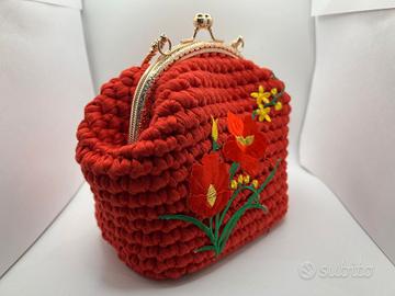 Borsette artigianali all’uncinetto in cordino rosso, impreziosite da ricamo floreale fatto a mano e chiusura in metallo color oro o argento dal gusto vintage, perfette come mini bag da cerimonia o per dare un tocco elegante a un outfit serale.