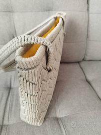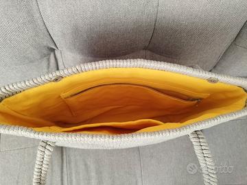 Borsa di medie dimensioni, grigio chiaro, con fodera e taschino interni, molto leggera.