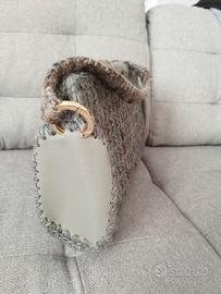 Borsa fatta a mano di lana di alpaca, mai utilizzata, con patella di chiusura e laterali in neoprene, chiusura e piedini in metallo, con fodera interna in feltro e due taschini.