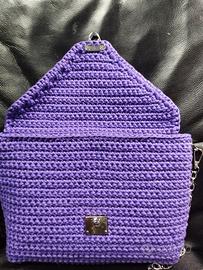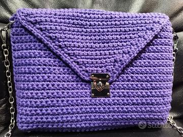 Borsa fatta a mano in cordino di cotone viola, con chiusura metallica, fodera in feltro. Nuova.