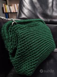 Borsa fatta a mano, in lana, verde scuro, fodera interna in feltro, chiusura con clutch e manico con catena. Nuova.