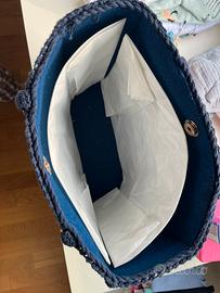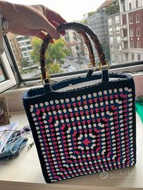 Borsa fatta interamente a mano con uncinetto. Colore sfondo blu con quadri rosa/bianco. Manici in bambù e chiusura con bottone. Mai usara