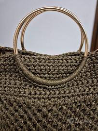 Borsa fatta a uncinetto Cordino lavorato a punto nido d'ape Manici rifidi oro e tracolla Foderata e chiusura magnetica
