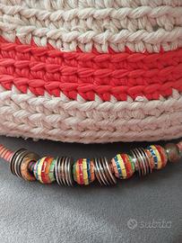 borsa fatta all uncinetto nuova tralizzata in fettuccia con due colori beige e arancio la tracolla è decorata con tanti cerchi colorati le misure larghezza 33 cm lunghezza 22 cm ideale per l estate