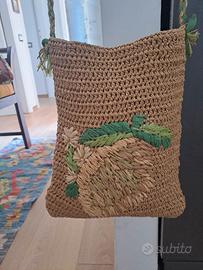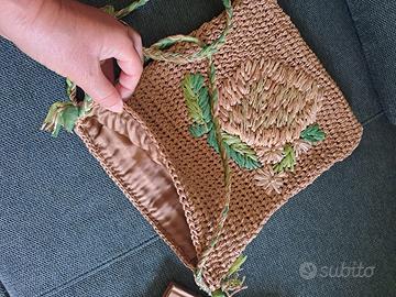 Borsa lavorata a mano in raffia di colore cachi, e manici piatti in cordella di raffia