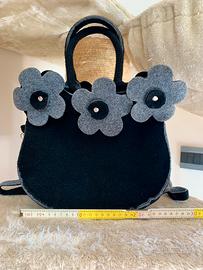 Borsa in feltro nera e grigia con fiori. Provvista di manico e tracolla.