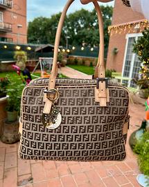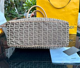 Vendo magnifica borsa Fendi zucchino modello iconico della maison caratterizzato dal celebre motivo monogramma "FF" manici e profili in pelle di colore beige. Includo nella borsa bellissimo ciondolo Fendi pagato a parte quando comprata in boutique. Condizioni pari nuovo in quanto mai utilizzata ancora con cartellino di autenticità.