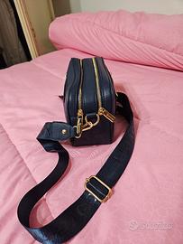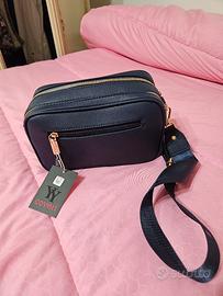 Borsa Enrico Comerio, blu in ecopelle, con tracolla regolabile e cerniere d' orate.