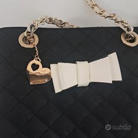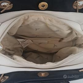 Borsa Fracomina originale, nuova mai utilizzata. Modello elegante in ecopelle trapuntata nera con inserti bianco latte e dettaglio fiocco frontale. Dotata di manici a catena color oro con inserti in similpelle e charm a cuore con logo. Dimensioni 30 x 11 x 36 cm, capiente e pratica per uso quotidiano. Caratteristiche: doppio manico con catena dorata chiusura con bottone magnetico interno foderato con logo e tasca con zip design elegante e moderno Condizioni: nuova, mai usata. Presenta solo lievi segni superficiali sui lati nella parte bianca, dovuti alla conservazione, non visibili nell’utilizzo e non compromettenti l’estetica generale. Ottima occasione per una borsa nuova a prezzo vantaggioso. Borsa raffinata e versatile, dal design iconico del brand. C00015326-50 abbigliamento, borsetta, accessori moda