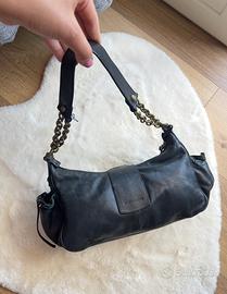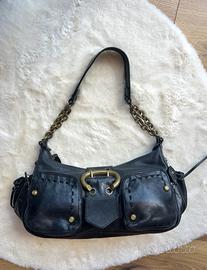 Borsa vintage del brand Francesco Biasia in vera pelle italiana con tasche anteriori con cerniera, fibbia centrale, catena sul manico e dettagli metallici color ottone.