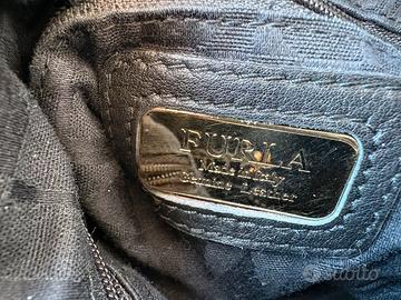 Borsa Furla originale in pelle nera in ottime condizioni: non strappi, cerniere ottime, sostituito con piccolo budda il tirante della tasca anteriore (v foto). Completa di custodia originale