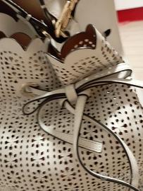 Bel secchiello estivo Furla, da portare a mano o con tracolla, con parte davanti traforata finemente, colore bianco, usato pochissime volte. misure 25x25x30 circa. chiusura con bel fiocchetto. completa di Dusty bag.