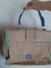 borsa mai usata, in pelle e pelle scamosciata dai colori vivaci e dai dettagli geometrici.