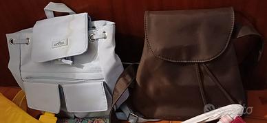 Borsa Garnier a righe rosa e bianca con manico bianco mai usata, zainetto azzurro Modita con alcune sbiaditure sul giallo, zaino Leopard viola con fiori, uno zainetto marrone e in regalo 2 marsupi presenti in foto.