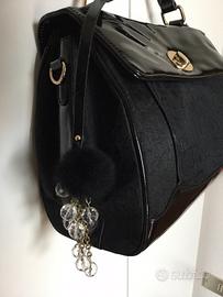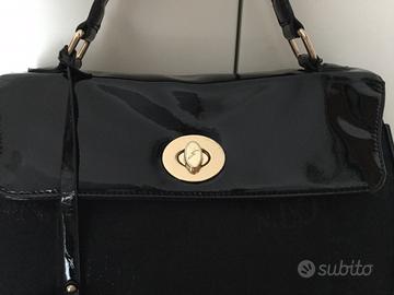 Borsa Gattinoni nera in stoffa e vernice. Tracolla rimovibile, tre scomparti interni e una tasca esterna.