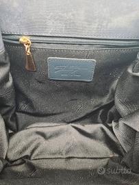 Borsa a secchiello Genny di Gianni Versace, Made in Italy (by Futura srl Pozzuoli), vintage, anni ’80; certificato Art. 828, Numerato: 125199. Realizzata con pellami di elevata qualità e pregio, primofiore, grigio-blu scuro; patta frontale con logo Genny inciso, chiusura a clip in metallo; laterale a soffietto con 4 bottoni a scatto; interno con tasca laterale a cerniera; fodera con targhetta pelle logo Genny; tracolla piatta in pelle, con rivetti laterali in metallo dorato. Dimensioni cm: L 23 x H 25 x P 10. Tracolla 94cm Condizioni: buone, lieve segno dell'età su pelle. Dustbag originale in tessuto bianco.