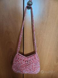 borsa melange in rafia e cotone, colori bianco e corallo, con applicazioni di perline in tinta, nuova, fatta a mano, tracolla con pomo di metallo per regolare la lunghezza