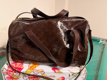 Borsa a mano in tessuto sintetico e manici in pelle colore marrone scuro con tasca interna. ottime condizioni mai usata , può essere utilizzato a mano e a spalla. Misure Larghezza:28 cm Altezza:15 cm Profondità:15 cm