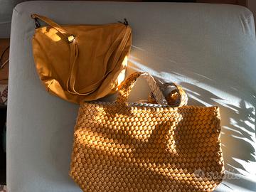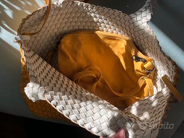 Borsa gialla intrecciata,con interno bianco e con borsa gialla contenitore interna con tracolla e cerniera ( vedi foto ).