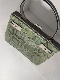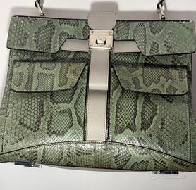 Vendo elegante borsa firmata Gianfranco Ferré in pelle con effetto pitonato verde e dettagli beige. Design strutturato e raffinato, perfetto sia per uso quotidiano che per outfit più eleganti. Chiusura con hardware metallico inciso Ferré, manico rigido e ottima capienza. Condizioni: •Ottime condizioni generali •Nessun difetto evidente •Interno pulito Caratteristiche: •Colore: verde pitonato + beige •Materiale: pelle (effetto pitone) •Manico rigido •Chiusura con clip metallica •Tasche interne