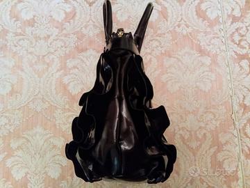 Borsa Gianmarco Lorenzi in vera pelle spazzolata colore melanzana 🍆. Con ruches su entrambi i lati. Borchie e fibbie in metallo dorato. Ottime condizioni. Misure: larghezza cm 30. Altezza cm 33. Manici cm 50.