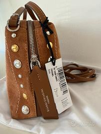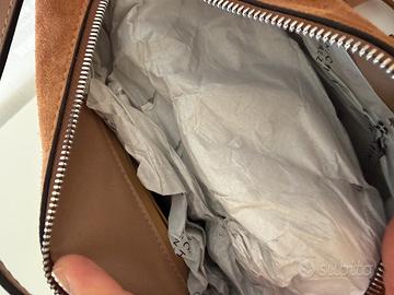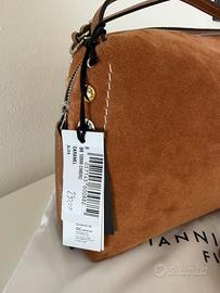 Borsa modello Alifa nuova collezione ss26 in pelle scamosciata Dotata di doppi manici per portarla a mano e di una sottile tracolla in tono, offre anche la possibilita di indossarla a spalla o crossbody, adattandosi a ogni occasione. Dimensioni: 26×16×12 cm
