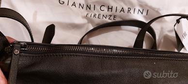 Bellissima borsa interamente in vera pelle nera, con tracolla regolabile, di Gianni Chiarini (Firenze). Colore nero. Nuova con cartellino. Le dimensioni sono 34 cm di larghezza e 28 di altezza, con 2 tasche esterne chiuse con zip e 2 tasche interne. Molto comoda e completa di Busta originale in tessuto, per riporla. Il prezzo indicato sul cartellino è di 295 euro, come si vede dalla foto, vendo a euro 150, è una vera occasione.