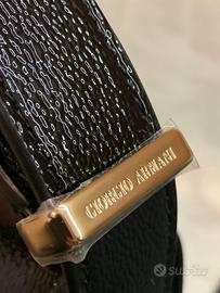 Modello molto amato perché reinterpreta il design originale creato da Giorgio Armani negli anni '90, unendo un'estetica minimalista a una costruzione artigianale di alta qualità. Splendida borsa firmata Giorgio Armani realizzata in pregiata pelle verniciata nera con una sofisticata texture lucida effetto crinkle. Il design contemporaneo a forma di mezzaluna e il logo 'Giorgio Armani Milano' impresso sul fronte la rendono un accessorio di classe assoluta, perfetto per la sera o per eventi speciali. La borsa dispone di un manico strutturato ed è in condizioni di nuovo, mantenendo perfettamente la sua forma e la brillantezza originale della pelle. Un pezzo iconico del lusso Made in Italy.