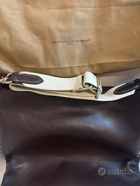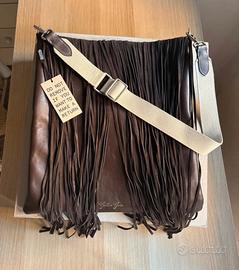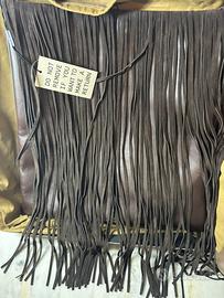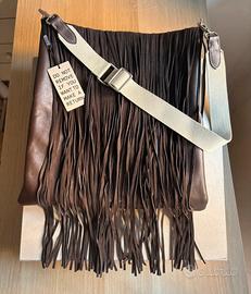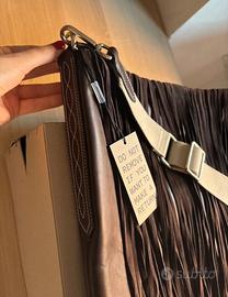 Colore: marrone testa di moro Materiale: pelle liscia di vitello di alta qualità Logo Golden Goose dorato sul fronte Dettagli: • Maxi anelli metallici laterali effetto vintage • Tracolla regolabile in canvas beige con inserti in pelle • Pannello frontale removibile con lunghe frange in pelle • Chiusura con zip • Interno foderato Borsa capiente e versatile, perfetta sia per look casual che più ricercati. Le frange possono essere rimosse per uno stilepiu minimal Dimensioni: 38×41×5 cm