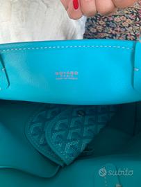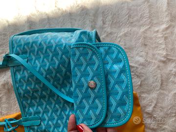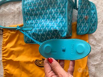 Goyard mini borsa tote anjou,nel colore turchese finiture in pelle e cuciture a contrasto.Viene venduta corredata di portamonete,dust bag ed altro accessorio.Condizioni perfette,non presenta nessun segno di usura,né macchie