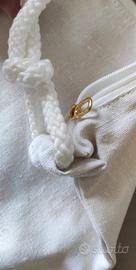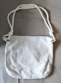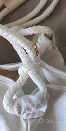 Particolare la tracolla in stile nautico, composta da una sorta di cima doppiata e fissata al centro.