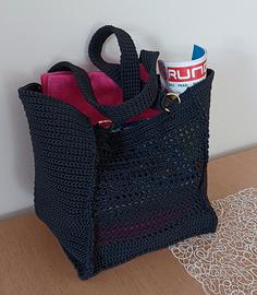 Borsa grandi dimensioni interamente fatta a mano all’uncinetto con cordoncino nero, m olto capiente e pensata come borsa spiaggia, ma adatta anche per commissioni varie. Particolare attenzione è stata data ai manici lavorato con il punto basso termico che non slabbra.