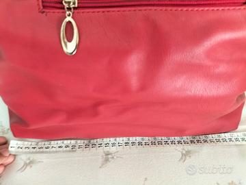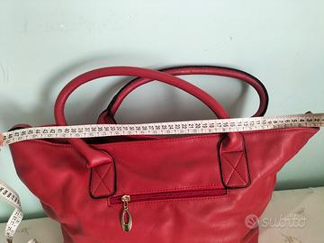 borsa rossa, alla base larga circa 35 cm. materiale similpelle. Possibilità di chiusura sia con bottoni che con cerniera. All'interno ci sono quattro tasche, di cui due munite di chiusura a cerniera. Molto capiente e comoda, adatta anche come piccola valigia per brevi viaggi.