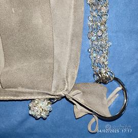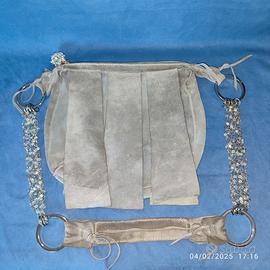 Vendo bellissima borsa a tracolla in vera pelle scamosciata, produzione artigianale made in Italy, usata poche volte, in ottime condizioni. Ha la chiusura con zip con un pomolo sferico in perline, è impreziosita da frange dello stesso colore e una particolare tracolla di 105 cm di lunghezza, formata da fili in metallo intrecciato e perline ed una striscia di pelle uniti tra loro con grandi anelli in metallo Internamente non è foderata e non ha tasche .Misure in cm: larghezza 30, altezza 29 e profondità 5. Borsa molto resistente, che presenta solo qualche piccolo segno di usura. Vero affare