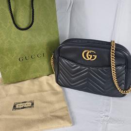 Borsa Gucci originale nera, usata in ottime condizioni, modello marmong GG medium a spalla matelassé con motivo chevron. I difetti sono microscopici: se guardata frontalmente, sul lato del gioiello GG dorato, l'angolo in basso a sinista, ha una leggera escoriazione; la suede interna in color carne, ha una parte leggermente consumata nella zona superiore alle tasche interne, dovuta a spazzolamento per pulizia; la doratura degli anelli dove sono legati i lacci in pelle dei tiranti per aprire la cerniera, è leggermente consumata. Il resto è perfetto come da immagini. Può essere indossata sia a spalla che a tracolla. Potrete valutarla personalmente, ma senza perdite di tempo. Solo veramente interessate/i. Verrà consegnata insieme alle sue shopping e dust bag, anch'esse originali. Posso anche spedire in tutta Italia con corriere espresso ma, considerando il valore dell'oggetto, accetto solo bonifico bancario. No contrassegno ne pagamenti elettronici.
