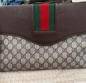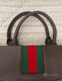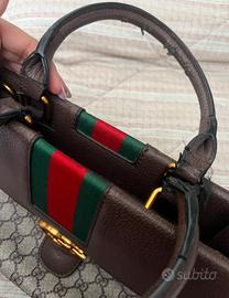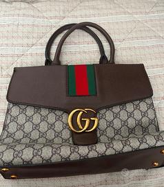 Vendo borsa Gucci GG Marmont originale con classico motivo monogramma, dettagli in pelle marrone e iconico nastro Web verde/rosso.